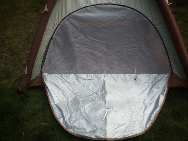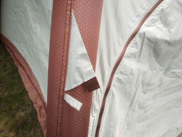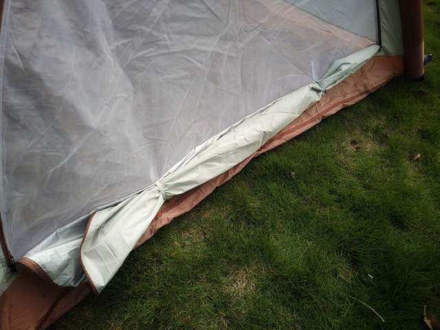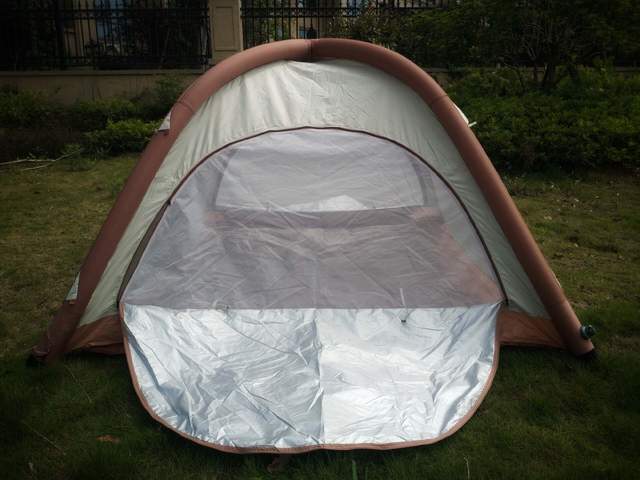 帐篷虽然是一体充气就可支撑起来,不过也是分为内外帐,这一点在双门位置均可看出,拉开外门还可看到帐篷有做涂银处理,防晒妥妥的。