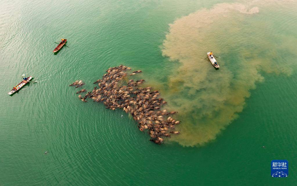 5月13日,在南充市蓬安县相如镇油房沟村嘉陵江段,成群结队的水牛渡江(无人机照片)。