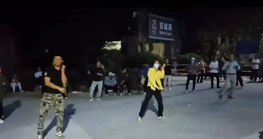 我走向前来,录她的视频。她继续奔放恣肆地跳着,先前那个迷彩服大哥也陪着她跳。这时百魔洞广场上主要就是他两个在跳。后面跟着跳的几个人,明显跟不上他们的节奏。