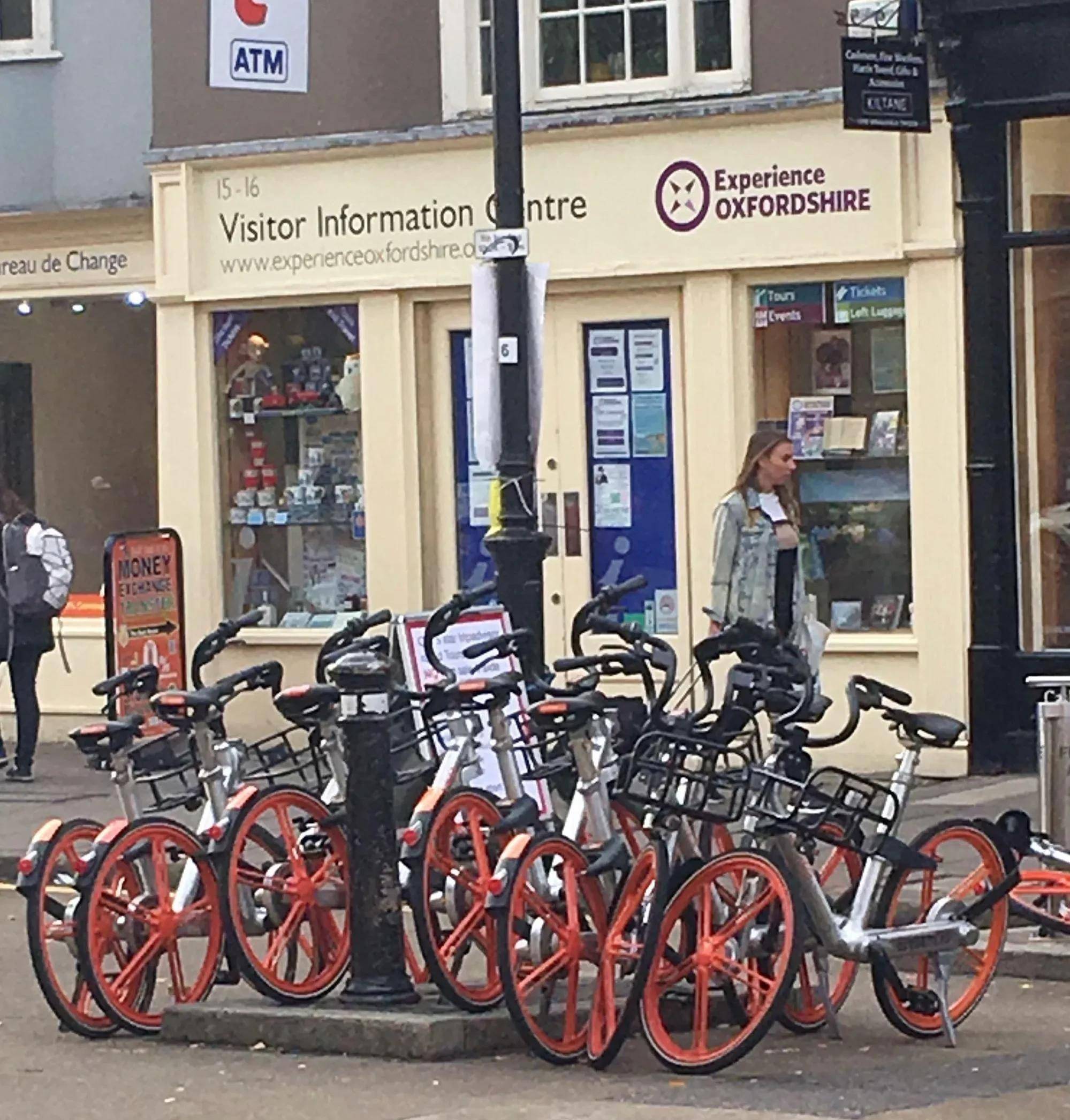 我在牛津大学城街头看到了摩拜共享单车,用手机上的国内摩拜APP试着扫码,居然成功了,于是还真骑了一会儿。