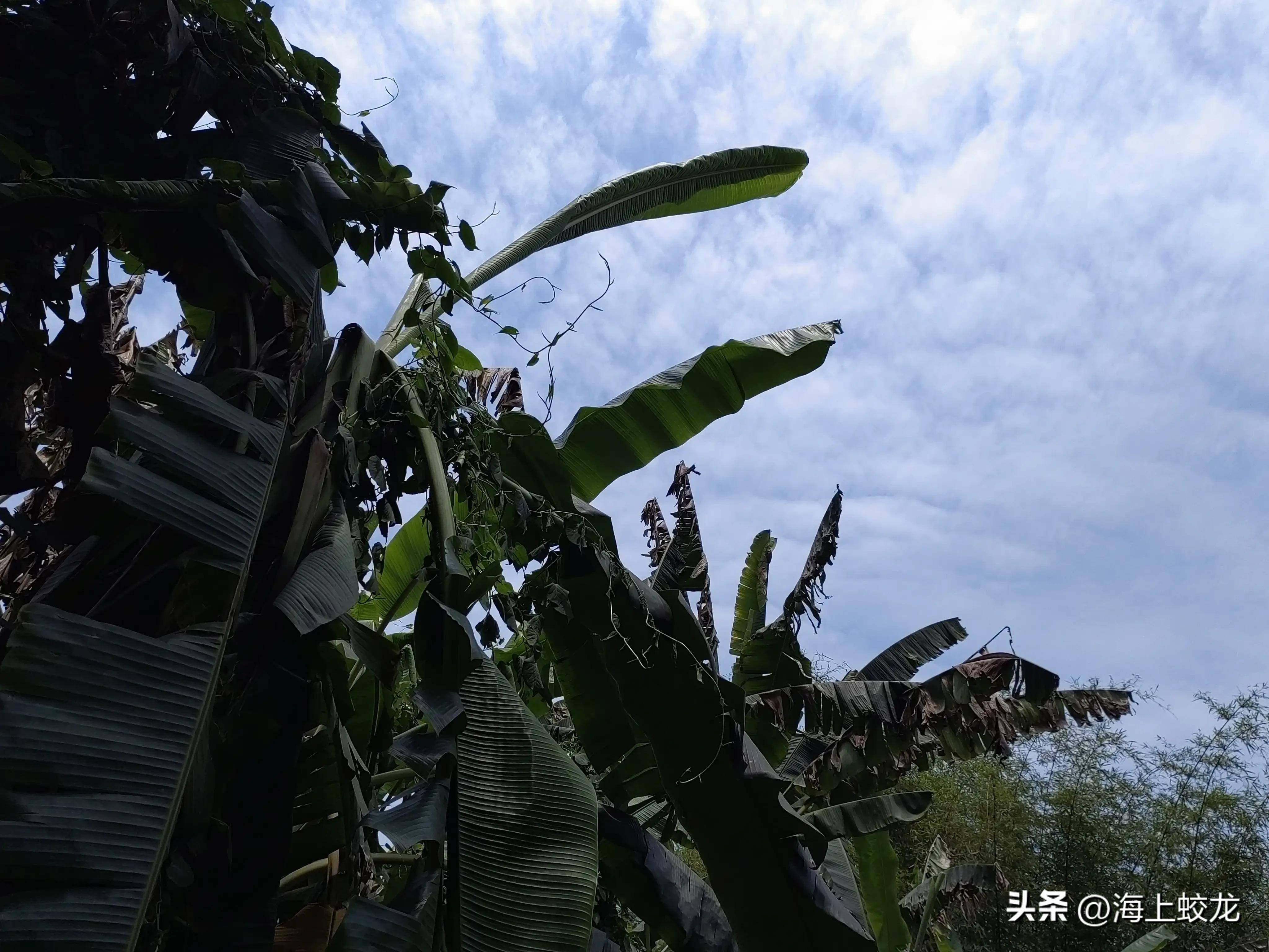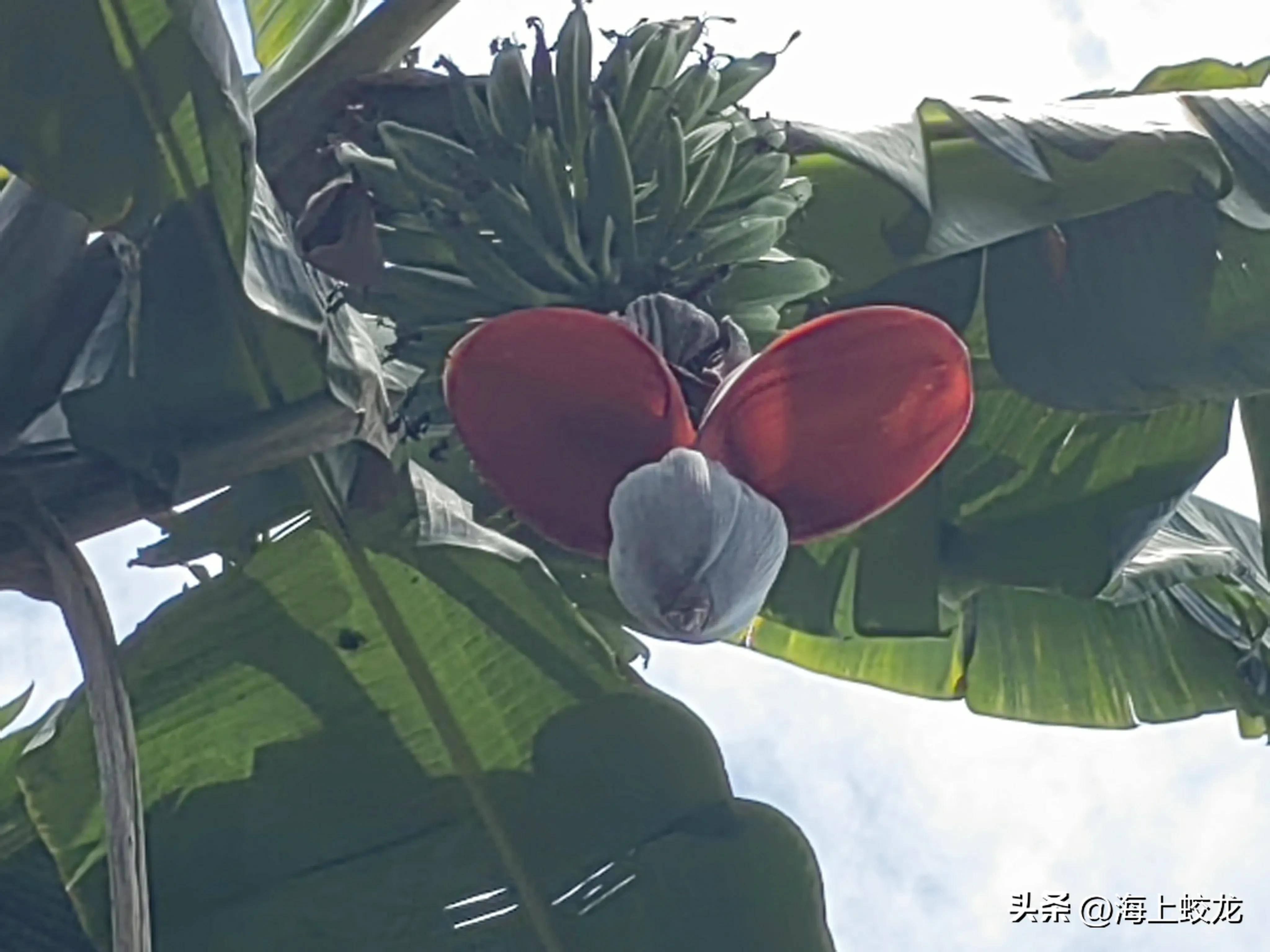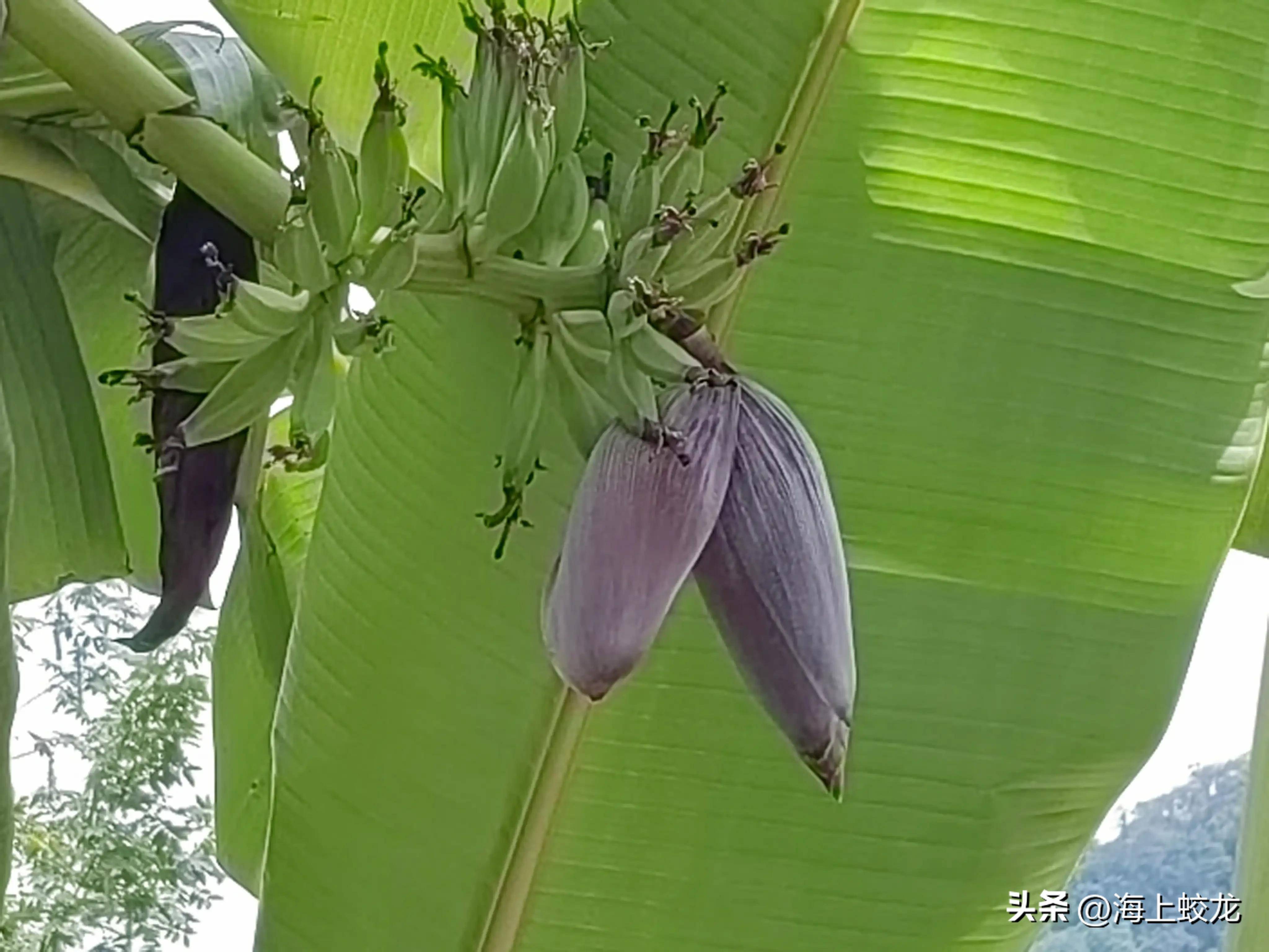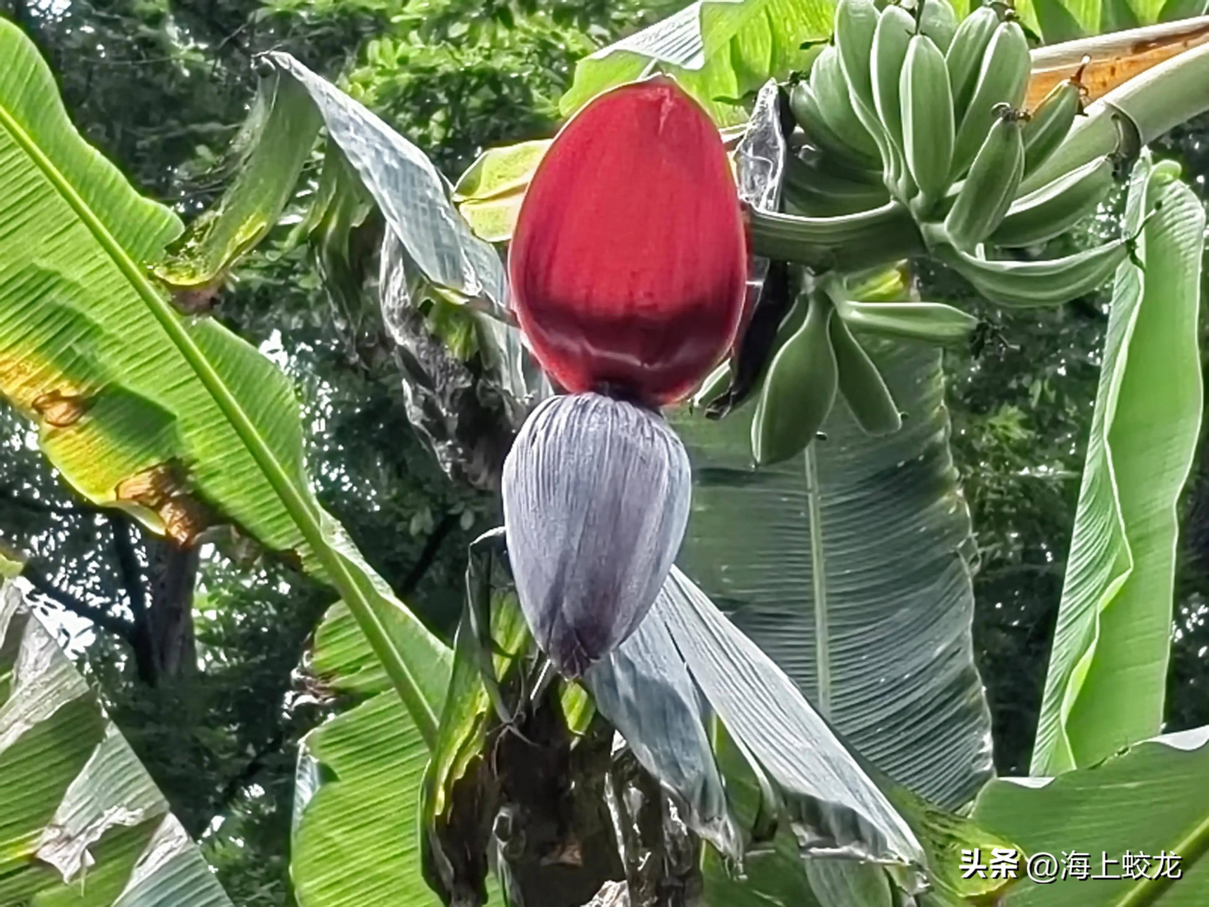 沿着道路向下行走,便可看到一片片茂盛的香蕉林,硕大的香蕉叶向上向外伸展着,尽情吸收着阳光雨露的滋润。蕉林里,一串串还未成熟的香蕉害羞地躲在叶片下。香蕉串的顶部,苞叶紧紧地包裹着,偶有一两片已舒展开来,鲜红的脸蛋露出了灿烂的笑容。