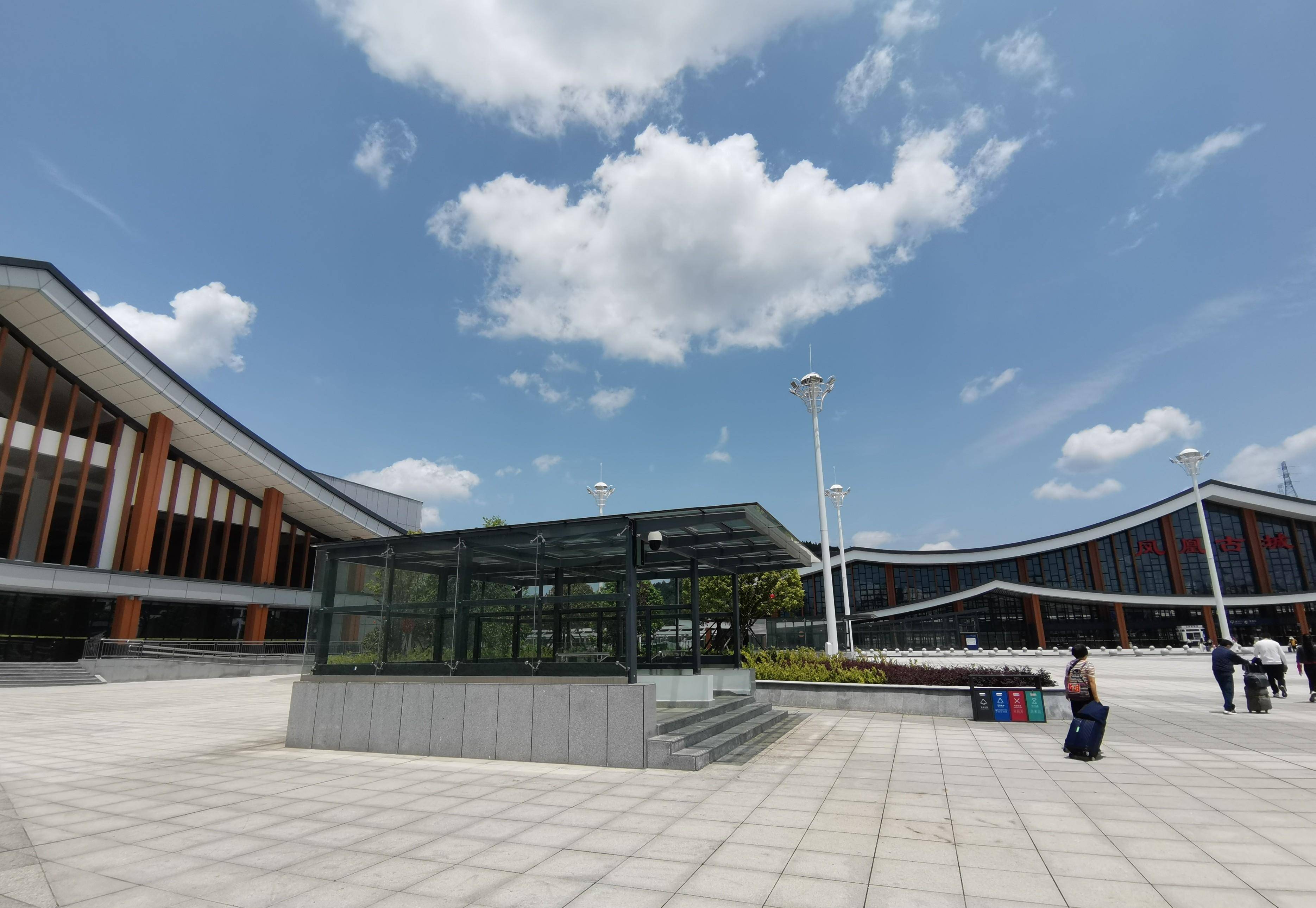 下图左边是接驳车的乘车车站,右边(其实是正中位置)是凤凰古城高铁站,今天的天气真好!