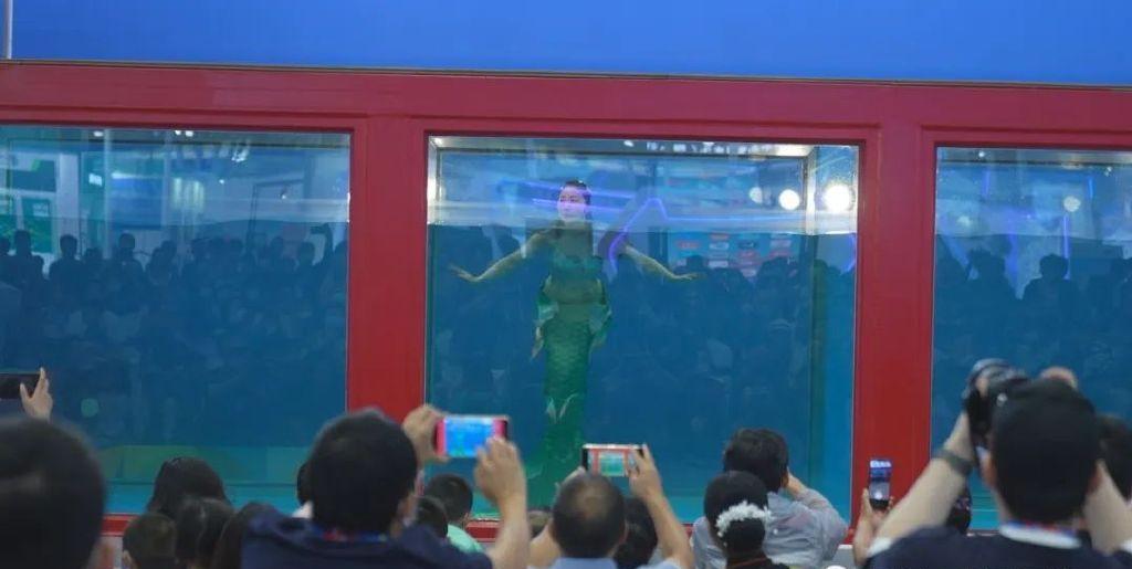 在渔博会1号馆,正在精彩上演的美人鱼表演秀吸引了大批观众围观,人气堪称“爆棚”。