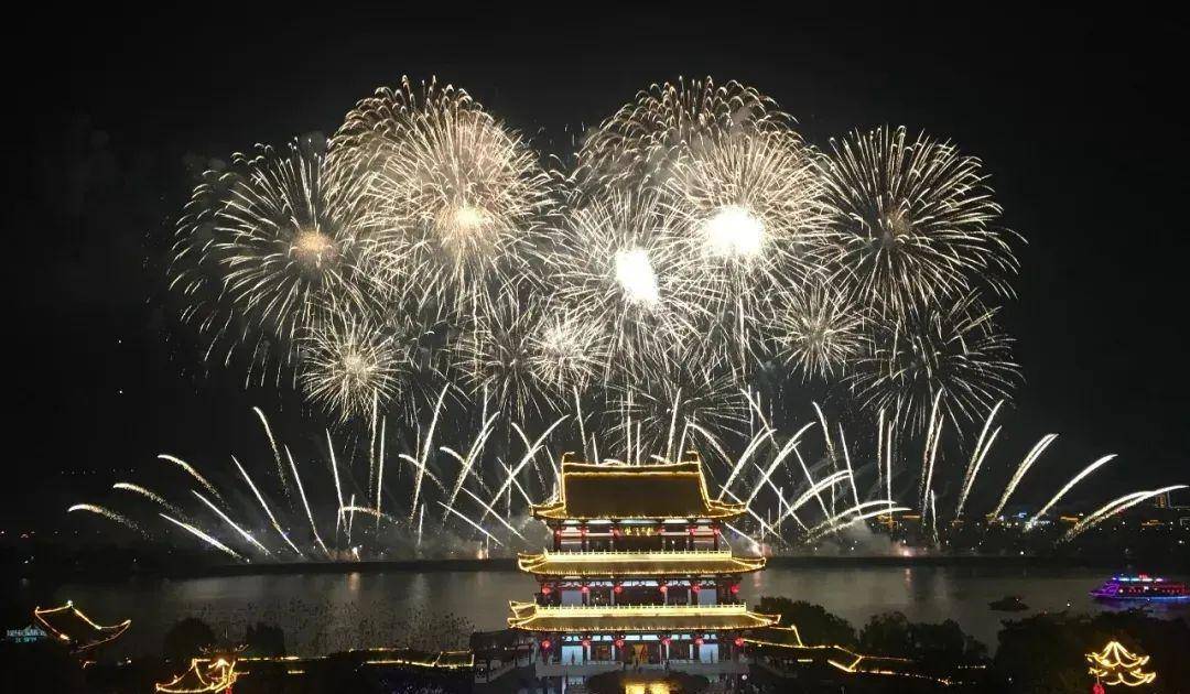 焰火精心选取充分体现晚会主题的音乐,通过3D特效立柱烟花、4D多维艺术烟花、特效立体焰火、唯美情景焰火、黑科技流星焰火等科技含量丰富的表演,形成高空瀑布、风铃、笑脸、桃心、中国结、迎客松等造型,呈现出巨幅超大烟花画面,进一步展示了快乐长沙之乐、韵味星城之韵。