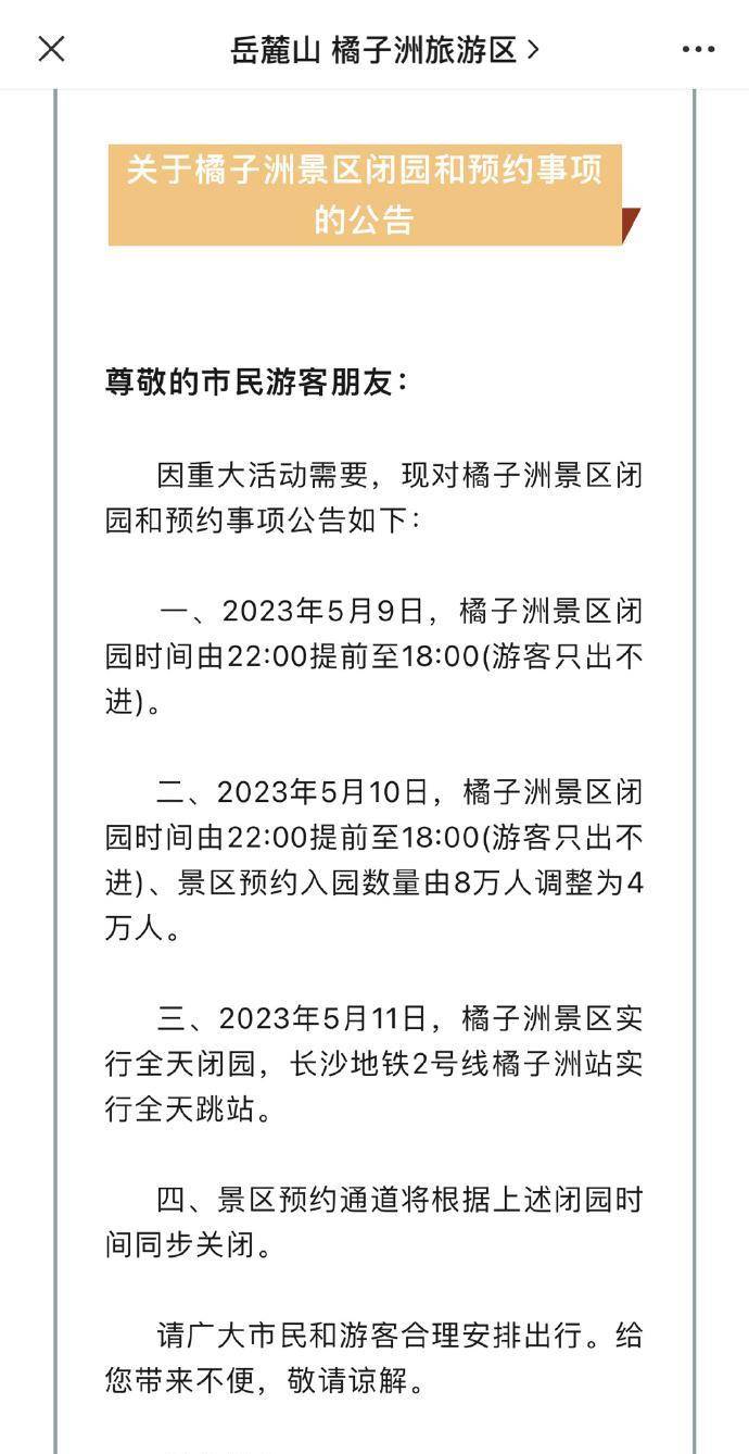 已有公告5月11日(橘子洲景区全天闭园、杜甫江阁全天暂停对外开放、长沙地铁2号线橘子洲和湘江中路跳站运营、市区江边合围禁飞无人机)这个“重大活动”就是:橘子洲烟花回来了