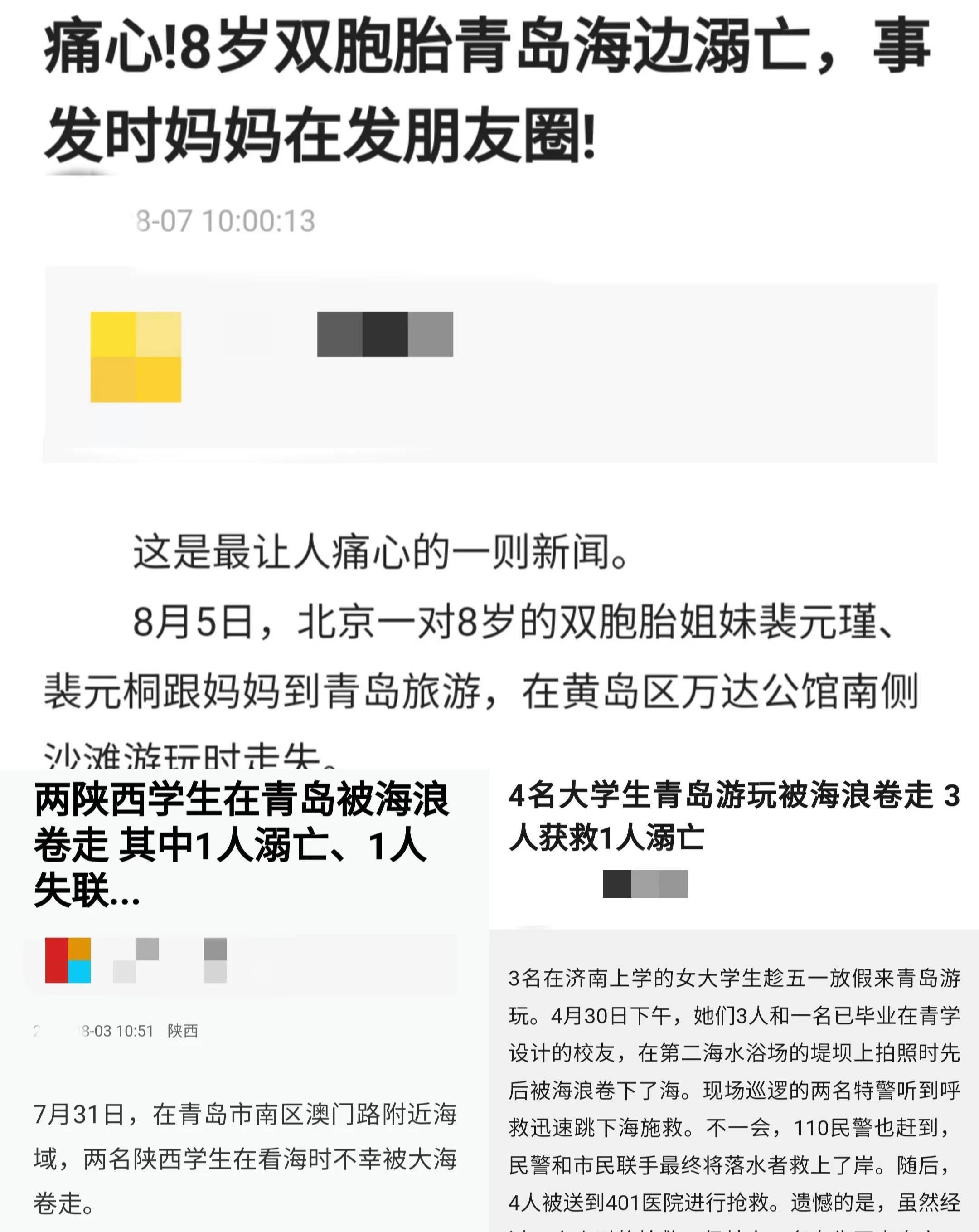 8月5日,北京一对8岁的双胞胎姐妹跟妈妈到青岛旅游,两个孩子在海边玩耍。结果因粗心妈妈在玩手机发朋友圈,转眼间两个女儿已经不见。当天当地警方在海中先后打捞到了两个女童,均已经没有了生命体征。