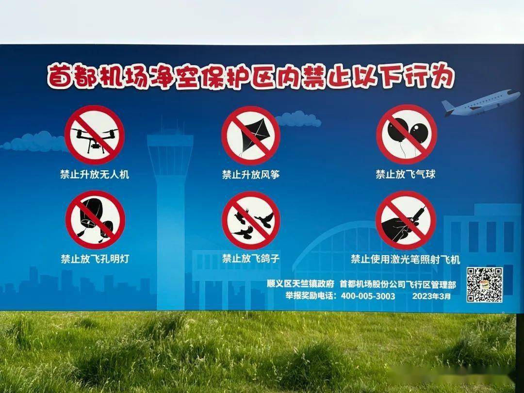 由于紧邻首都机场,这里的禁忌也有一些,如上图:禁止飞无人机、放风筝、放气球等。