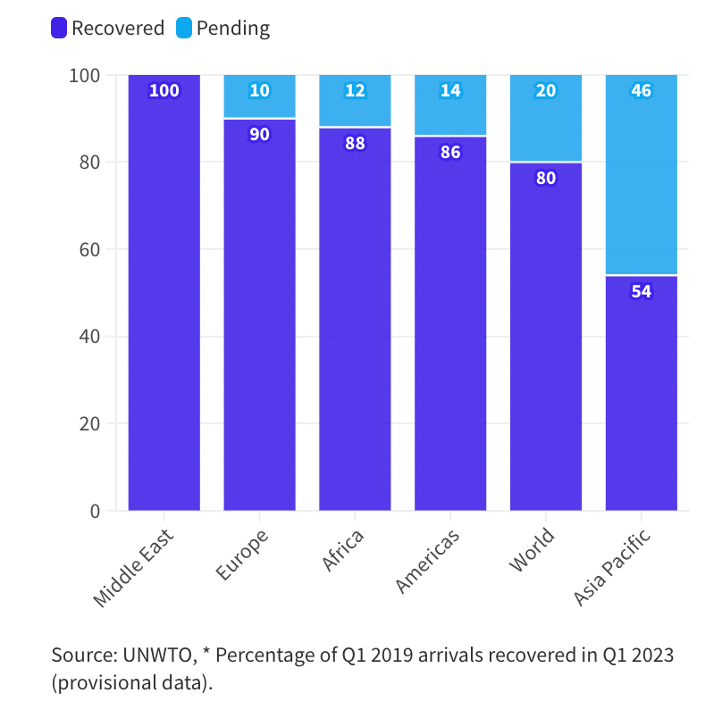 根据联合国世界旅游组织(UNWTO)公布的数据显示,一季度全球国际旅游人数是2022年同期的两倍,达到疫情前水平的80%。