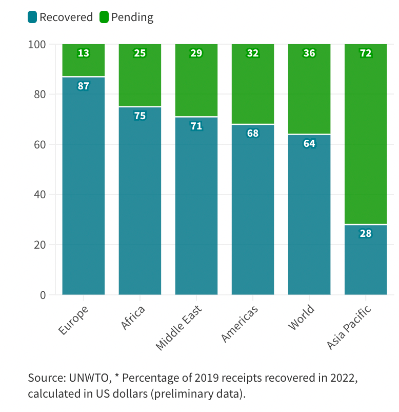 按地区来看,欧洲表现最佳,旅游收入接近5500亿美元(5200亿欧元),达到疫情前的87%。非洲达到75%,中东达到70%。由于长期的边境关闭,亚洲达到疫情前的28%。