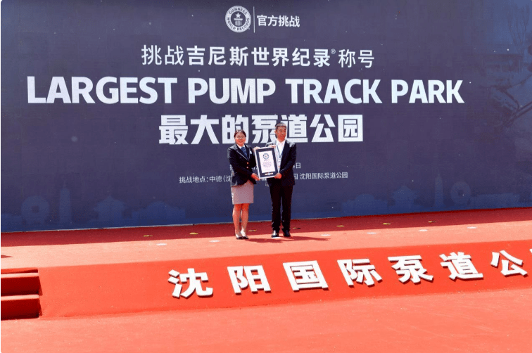 “我谨代表吉尼斯世界纪录很荣幸地宣布,经过第三方专业测量机构测量,最终泵道公园的面积为7991.75㎡,超越了挑战目标,挑战成功!”随着认证官熊文女士的宣读,一项新的吉尼斯世界纪录诞生——沈阳国际泵道公园被认证为世界最大的泵道公园,拿到了“Largest pump track park 最大的泵道公园”吉尼斯世界纪录认证证书。