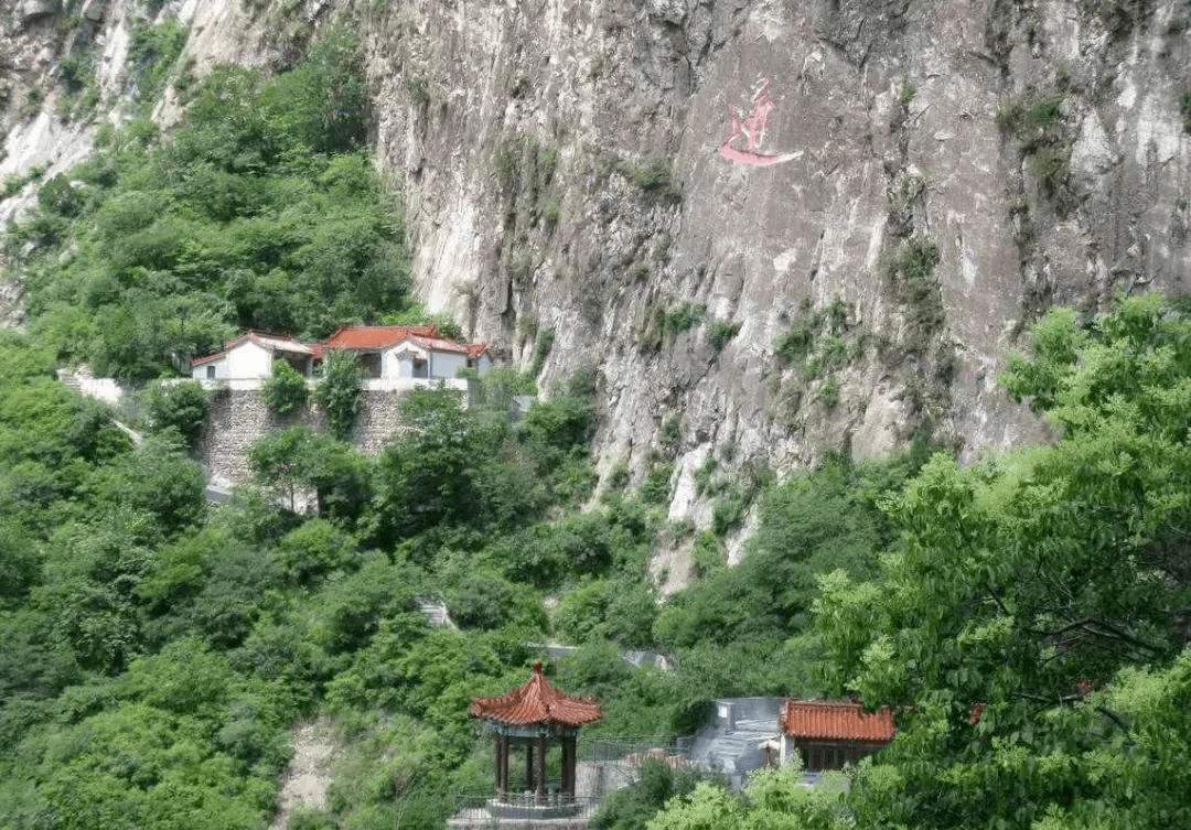 自二十八盘扶摇直上,可见长春洞、关公祠、药王殿,更可见到绝壁上的西山圣母巨形石刻和高达6米的道字。