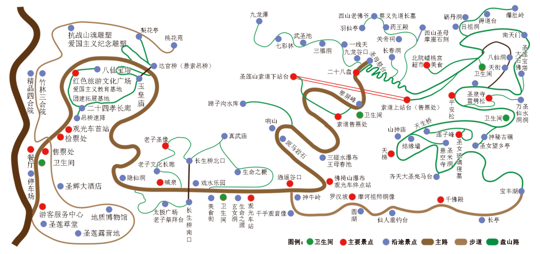 到达圣莲山顶,即可按照一峰两院三奇松的口诀,游览主要景点:
