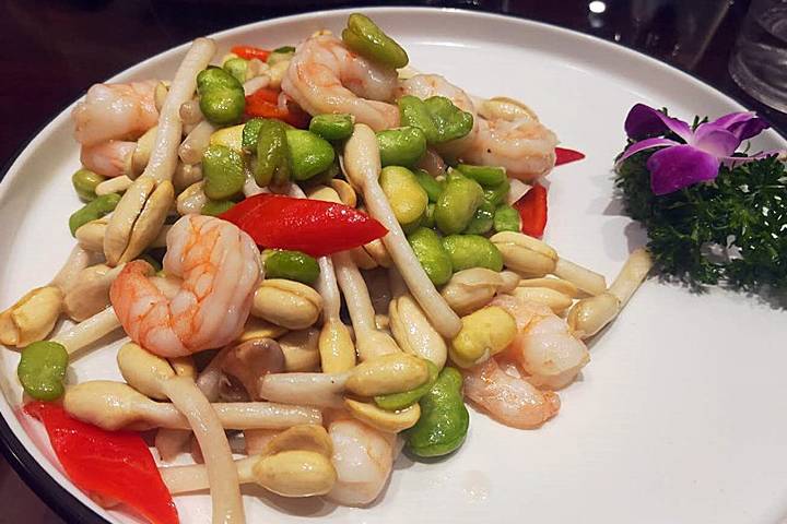 龙井虾仁是杭帮菜经典范例,移植过来后,龙井茶调整为北方人喜欢的花生芽喝青豆,此菜看上去如小家碧玉,清秀典雅;味之清淡,但不失鲜美;肉质滑嫩紧实,配上清淡的花生芽和青豆真是一绝。