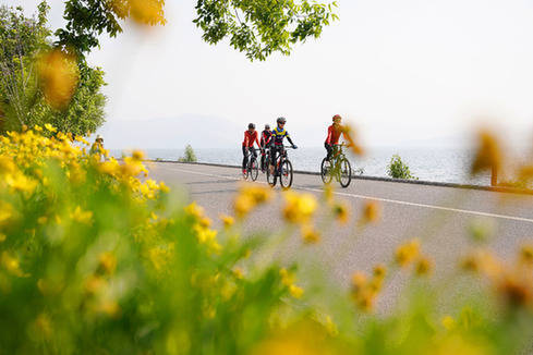 4月20日,骑行爱好者在云南大理洱海生态廊道骑行。新华社记者 宋为伟 摄