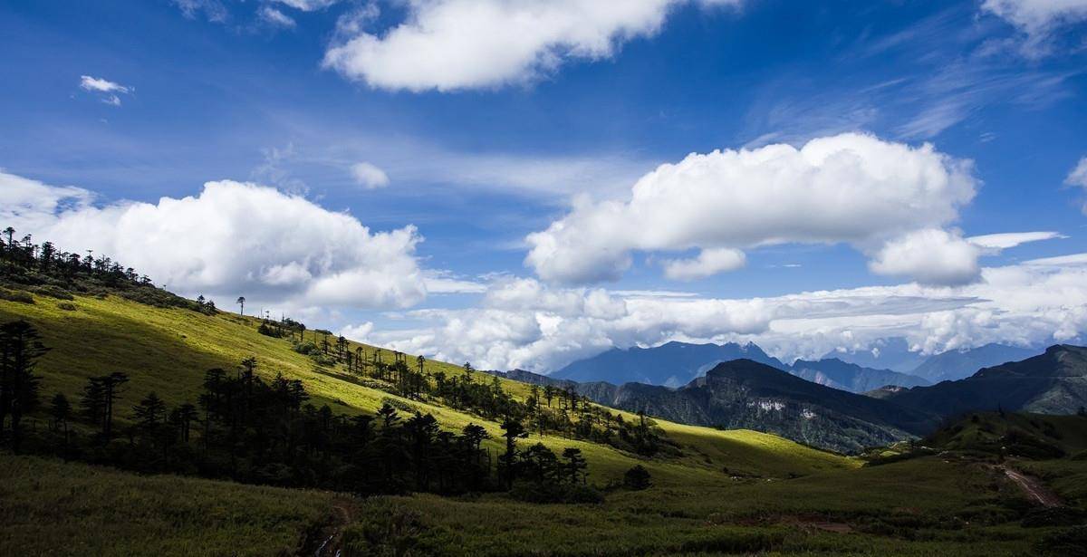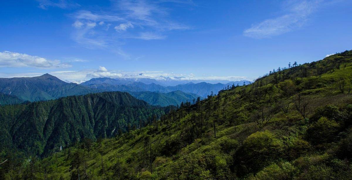与对面的牛背山不同,牛背山东面光秃秃,适合徒步行走,没有行走在原始森林中的快感,但是在前往四人同山山顶的道路上,沿途风景格外不一样,植被茂盛,这里更加适合自驾游,随时停车就可欣赏风景。前进到山腰处,山中的浓雾逐渐散去,远处云海翻滚不止,在蓝天之下,山间的瀑布飞下,储存在最美好的一刻。