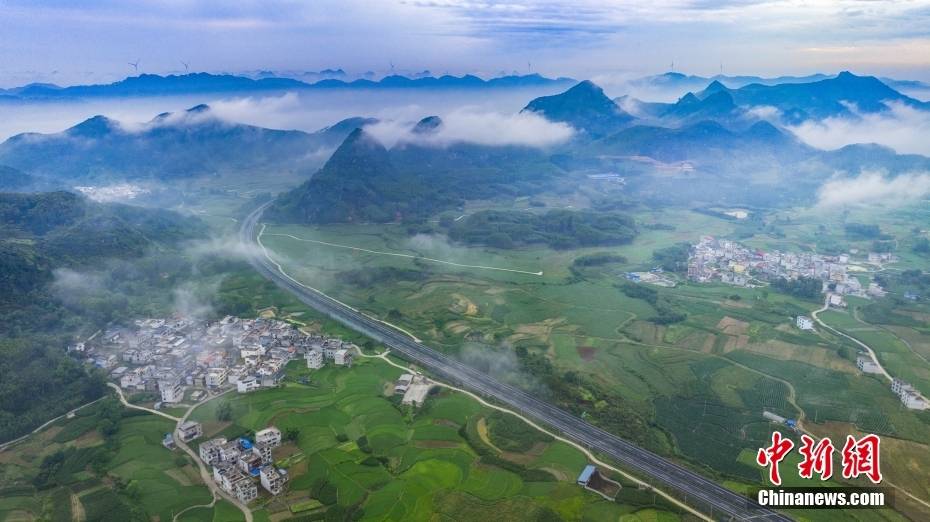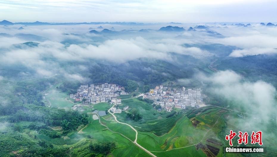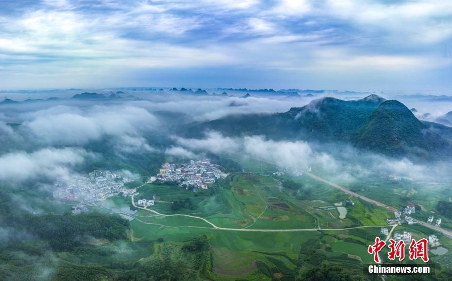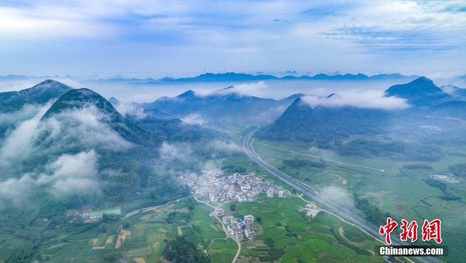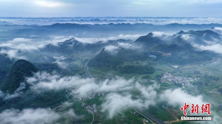 5月14日,南宁,雨后初晴,马山县林圩镇甘豆村现云海景观,延绵的喀斯特山峦间云雾缭绕,山峰、村庄、田野和公路在云雾中若隐若现。