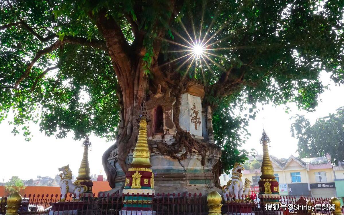就在城区繁华路段,是一个开放式景区,24小时都可免费打卡。一棵枝繁叶茂的菩提树,其树根缠绕覆盖了塔身。树塔相依相存数百年,顶上枝叶葱茏,脚下佛塔生辉,极具传奇色彩。传说是先有塔,后有鸟儿衔来菩提树种子,在塔的缝隙里生根发芽。塔树共生,成为当地一道奇景。