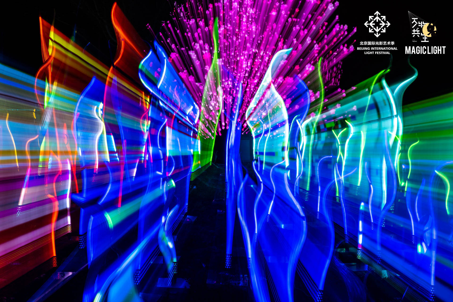 今年的北京国际光影艺术季(玉渊潭站)继续以“人与自然和谐共生”为主旨脉络,选取“光”为元素意象,探索奇妙之光,创造一个崭新的数字镜像艺术家园。据介绍,展区研发升级了7处数字互动场景,原创音视频内容千余秒。运用国家级非物质文化遗产琉璃烧制技艺,烧制“琉璃仙草”百余支,种出了一片“琉璃森林”。首次在场景中应用了曲面激光技术,将单点激光光源显示变成全角度的激光面显示;基于多视点裸眼3D立体视频技术,创作结构最复杂的多层次多视角裸眼3D视觉效果,并联动特定舞美装置,打造视觉奇幻盛宴。