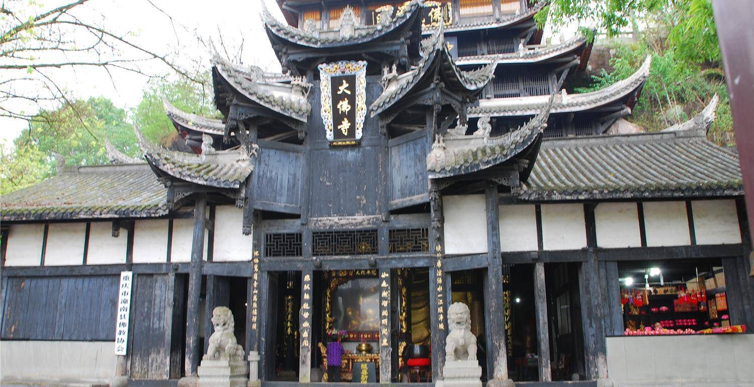 大佛寺内环境优雅,建造位置很有特点,在临江北面的山崖下,背靠大山还可望到江水,这是一个唐代歇山式的建筑框架结构,一开始,本来人们是打算在这个山崖上开凿一个大佛出来的,但是最后不了了之,到北宋时这个工程才正式开始,在建造的过程中还曾遭遇洪水,刚好飘来了很多巨木,建造者就用这些巨木建成了一个的“七檐佛阁”。