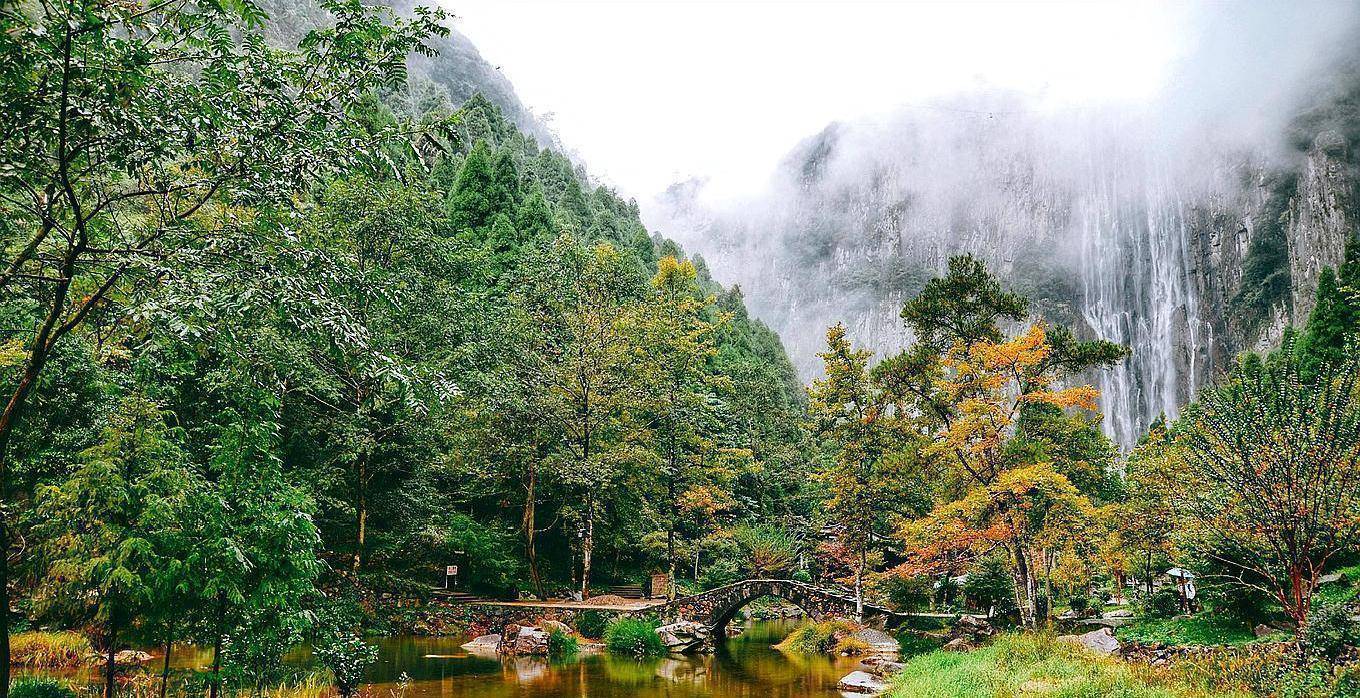 阔烈的水流似乎从天上直接倒下来一样,飞冲而下,却又悄然汇成一湾水潭,然后在接二连三的石头中,化为小溪静水深流,也不知是谁的奇思妙想,竟然在溪边建了凉亭、长廊、拱桥,再配上四季常青的植物,仿若苏州园林一般温婉细腻。