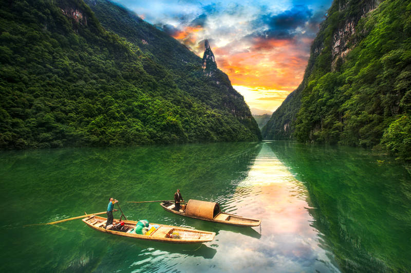 芙蓉江风景名胜区位于重庆武隆区江口镇,是一个江峡型小尺度大容量喀斯特地貌和原始水上森林型风景区,景色既瑰丽又壮观,秀水碧波,丝竹垂吊江边,古树如虬参天,时而水平如明镜鱼翔浅底,时而滩急似银河猴跃群山。