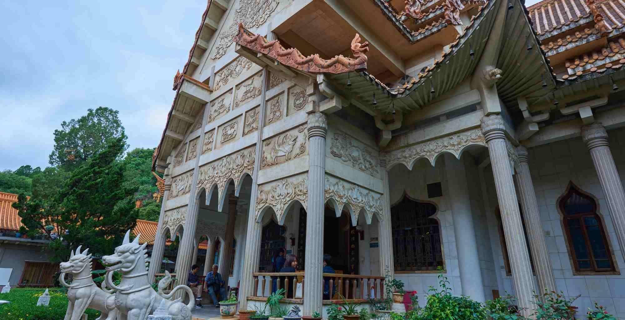 而沿着坡往下,便可看见一处牌坊,上书“圆通胜境”四字,据说这是清代吴三桂建造的,牌坊前面便是前厅,厅内宽敞无比,供奉着释迦太子说法像,是用纯铜浇铸而成,有2米高。穿过前厅的回廊,有一水池,池水中间是康熙年间建造的八角亭,亭内供奉的是千手观音,四周的石廊上还雕刻着数百对大小不一的石狮,工艺精湛,南北两处用石桥相互连接。