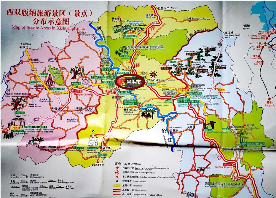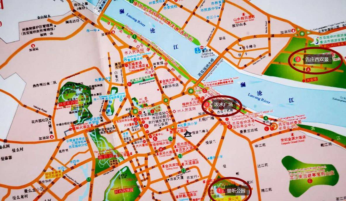景洪市区没啥玩儿的,景点几乎都在近郊、下面的县城或者小镇,看下图,景洪市区就是图中间圈起来那么一点点大,剩下的景点基本都是要包车或者坐长途车去的,所以如果组团来玩儿确实是有包车的需求。