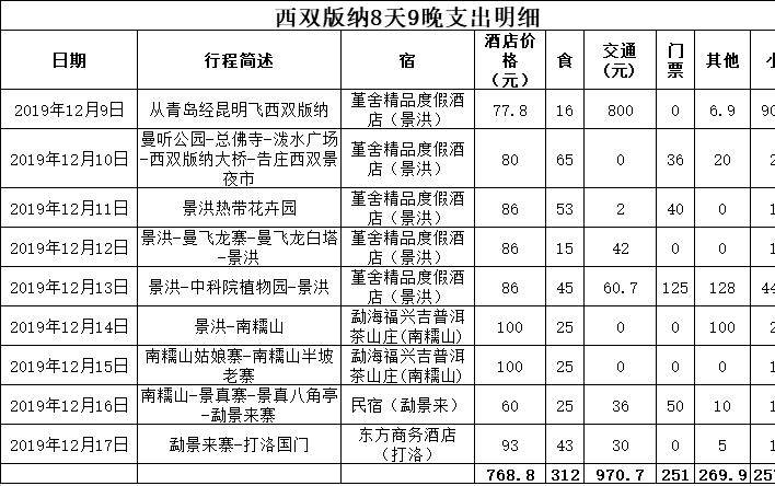 因为要写这篇版纳的攻略,昨晚就把旅行支出明细整理了一下,算完我也挺惊讶,玩儿了8天9晚,一共花不到2600,吃的住的我觉得还可以,花费不算贵主要原因是去的时候是淡季,机票酒店比较便宜,另外就是没去门票太贵的常规景点。
