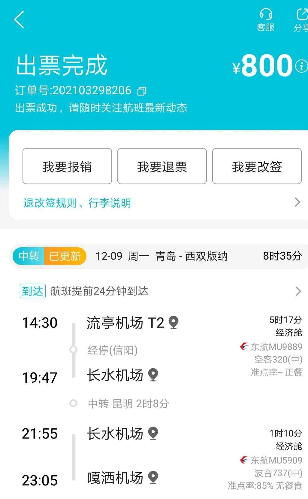 从青岛飞版纳没有直达,我买的是从昆明中转的机票,中午出发,晚上到景洪,时间也比较合适,不用早起赶飞机还是很幸福的,票价800元也很划算。