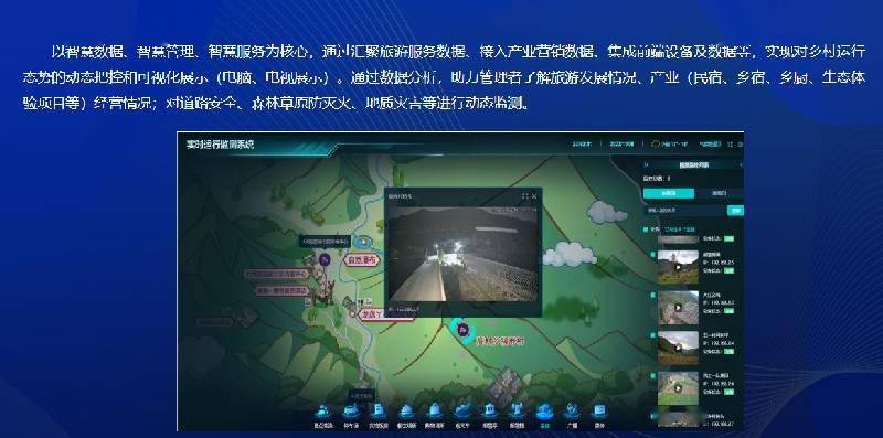 同时,通过汇聚旅游服务数据、接入产业营销数据、集成前端设备及数据等,实现对乡村运行态势的动态把控和可视化展示。“通过数据分析,可以更加直观清楚地看到全乡旅游发展情况,包括民宿、乡宿、乡厨、生态体验项目等经营情况,同时对道路安全、森林草原防灭火、地质灾害等进行动态监测。”平武县高村乡相关负责人介绍。