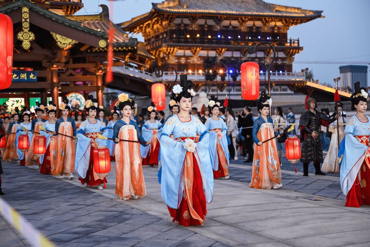 “五一”期间,隋唐洛阳城国家遗址公园延续国风、汉服“出圈”热度,在宫城区推出国风穿越节、国风达人巡游等系列国风活动,让游客沉浸式感受国风洛阳的千年风华。在隋唐洛阳城应天门北广场,新设置牡丹诗词路与应天门3D投影秀让古都辉煌的夜景打卡场景跃然眼前。同时,《簪花迎远客》《天门花坊奇事录》《武皇临朝》《神宫乐舞》等古装演艺与隋唐洛阳城应天门、明堂天堂内辉煌壮丽的实景场景结合,营造出一场神都盛景,让穿汉服奔赴洛阳的游客过一把“穿越”瘾。