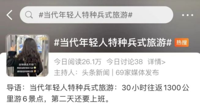 #大学生特种兵旅游#忽然冲上各大平台热榜,相关话题视频甚至已经累计了上千万的播放量,多数网友羡慕大学生优秀的身体素质,羡慕他们引领风潮的游玩方式。但也有人对此有着不同的见解,认为这样的旅行方式过于“走马观花”,过度劳累透支自己的健康,影响正常学习。其实,旅游是一种非常“个人”的休闲方式,对于大学生而言,特种兵式旅游或许更多的意义在于经历和感受。在大众旅游的时代,“特种兵式旅游”的出现,让旅游成为了一场年轻人的社交活动,使其不再局限于观光式的视觉享受,而转变成抚慰心灵的生活方式,而“特种兵式旅游”的价值,参与其中的人才最有发言权。