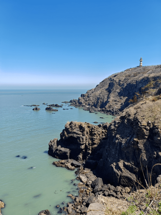 初夏的鸡鸣岛,被绿色植被覆盖着,坐在海边的长椅上或观景台最高点迈过护栏的地方,面朝大海,海水的颜色随阳光变换绿色,脚下就是悬崖峭壁,非常适合放空大脑,享受只有大海、呼吸、海浪拍打礁石的世界。