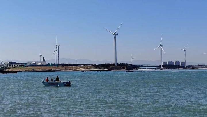 在船上回望陆地,可以看到不远处几个高大的白色风车在不知疲倦地旋转;往海面看,可以看到我们正驶向一座高出海平面不到一百米,宽也不过一百米的小岛。岛的一侧有一个石柱般的礁石,独自矗立在海边,犹如在翘首以待出海的人回家。
