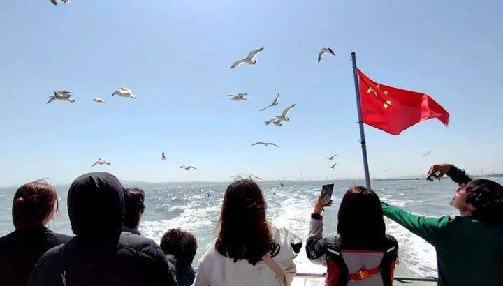 在这短短的十几分钟里却有许多乐趣,我们运气很好,成群的海鸥一路追随着游船,船上的游客都在拿火腿肠喂海鸥,海鸥就低低地贴着我们的头顶在飞,不断发出热烈的叫声。