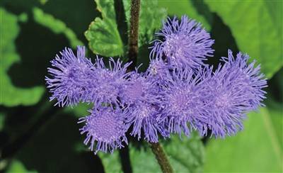 藿香蓟的颜色有较多的变化,有蓝紫色、紫红色、花白、粉红、蓝或紫红等色,花期7~12月。最常见的颜色是紫色,一簇簇的就像绣球,连成片就像是紫色花海,加上它的花果期是全年无休的,所以它常用于花坛、盆栽、地被花境、缀花草坪。