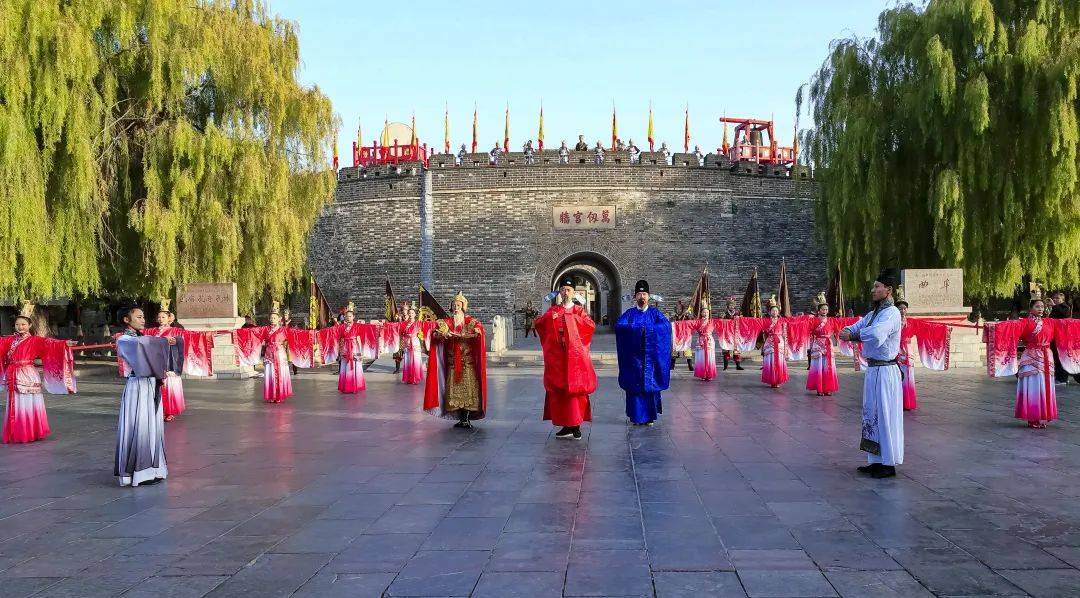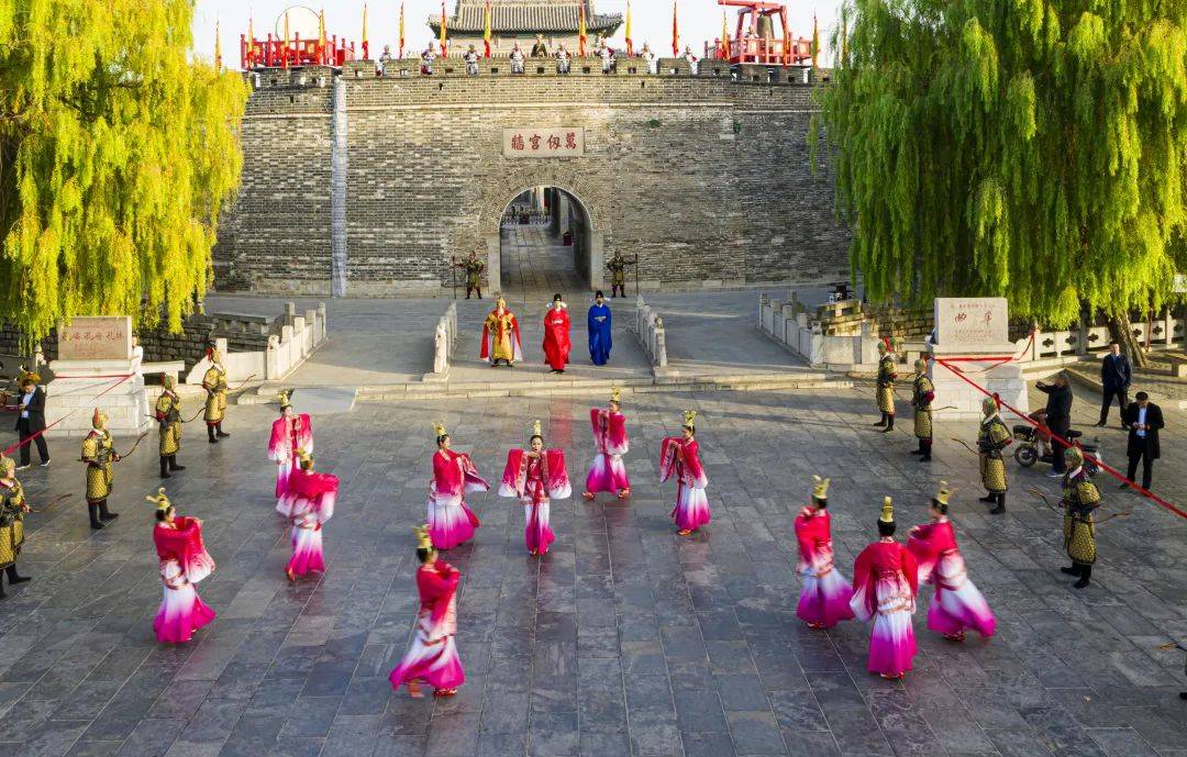 晨钟开城仪式融合吉时晨钟、乐舞迎宾、嘉宾入城三个传统礼仪的内容,乐舞划分为乐舞迎宾、射舞、书舞、御舞四大篇章。