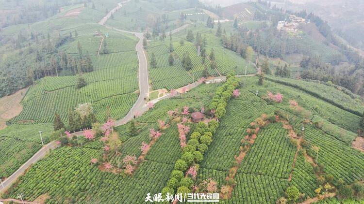 航拍贵州省黔西南布依族苗族自治州普安县茶源街道联盟村春季茶园景色。刘朝富 摄
