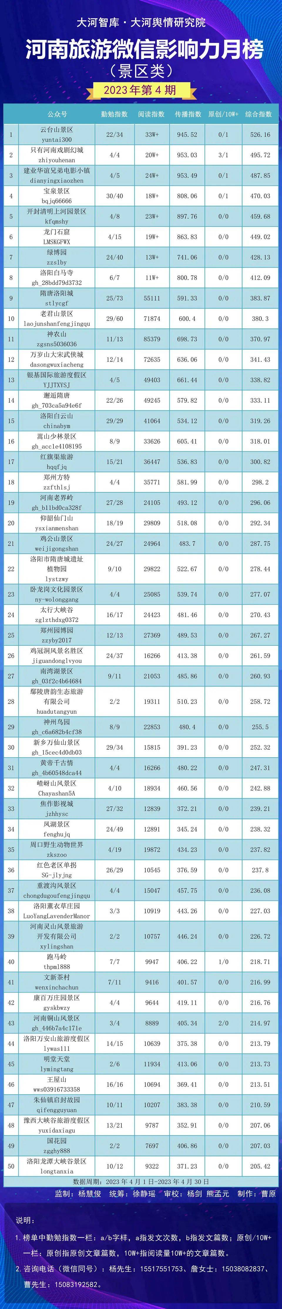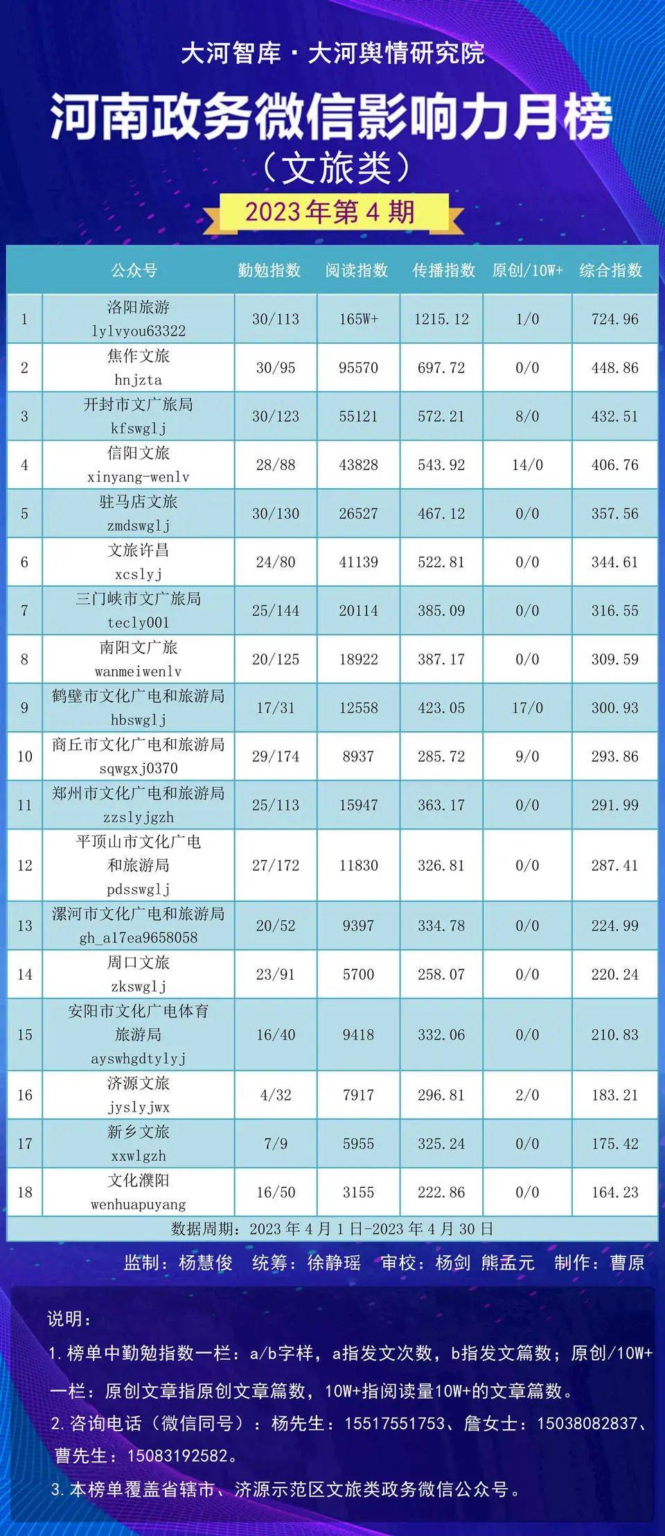 本榜微信公众号排名依次为:洛阳旅游、焦作文旅、开封市文广旅局、信阳文旅、驻马店文旅、文旅许昌、三门峡市文广旅局、南阳文广旅、鹤壁市文化广电和旅游局、商丘市文化广电和旅游局、郑州市文化广电和旅游局、平顶山市文化广电和旅游局、漯河市文化广电和旅游局、周口文旅、安阳市文化广电体育旅游局、济源文旅、新乡文旅、文化濮阳。