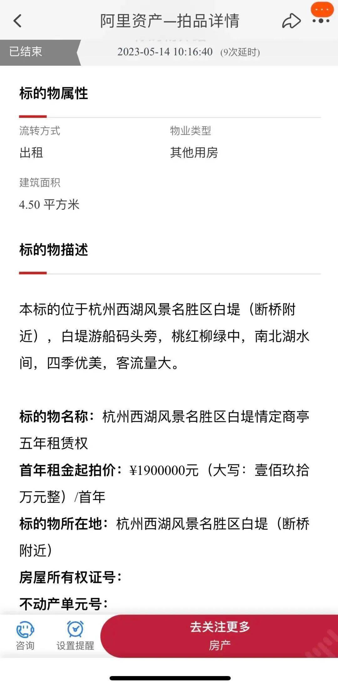 5月14日上午10:16,经历了68次竞价,杭州西湖风景名胜区白堤情定商亭租赁权拍卖有了结果,首年租金起拍价190万,最终成交价284万,溢价近50%。