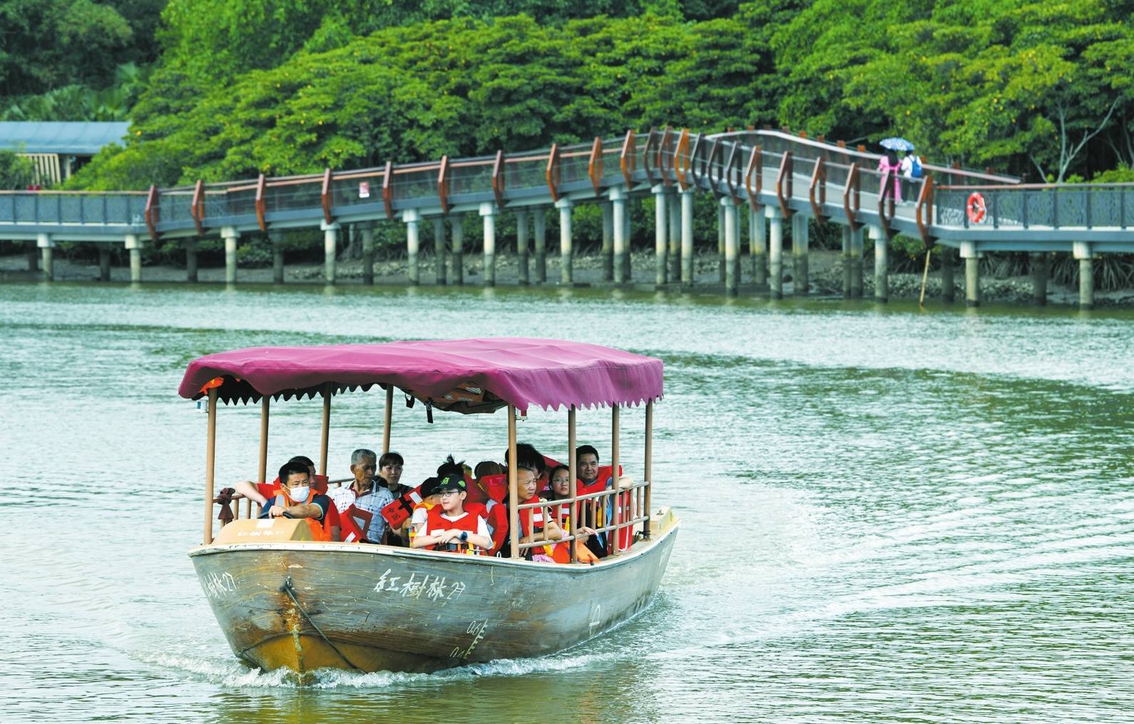 市民游客乘坐观光船游览海口红树林旅游区。
