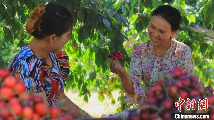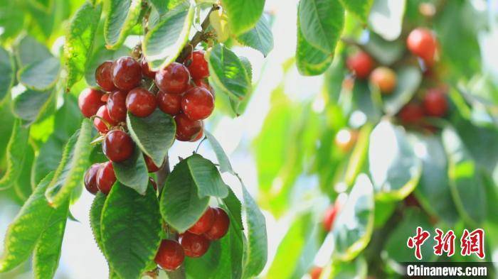 中新网记者走进莎车县米夏镇夏玛勒巴格“米夏红”樱桃精品园里,翠绿的枝头上挂满了鲜红的果实,果农们正忙着采摘。
