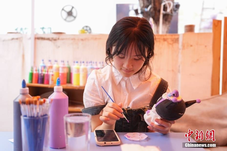 5月10日,家住附近的刘紫轩在环西北里一家陶艺工坊中为自己喜爱的卡通形象上色。崔楠 摄