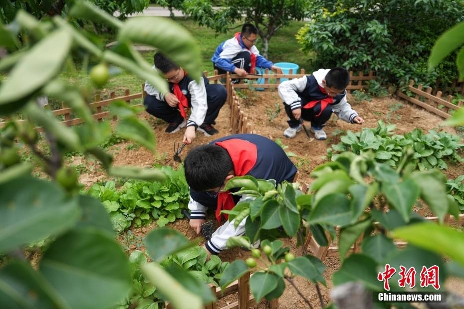 5月10日,学生们在照料校园“节气农场”中的作物。崔楠 摄