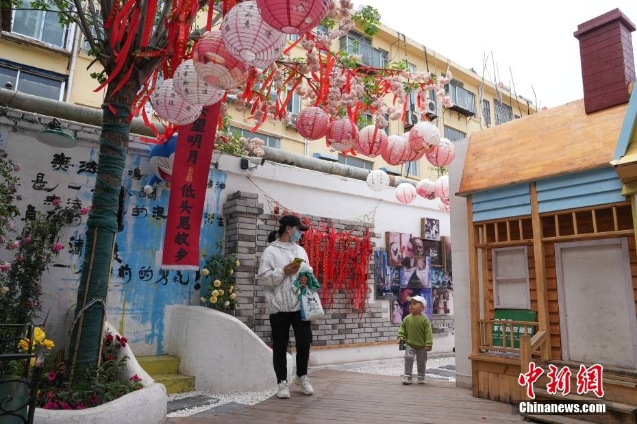 5月10日,市民带着自己的孩子在环西北里文创街区游玩。