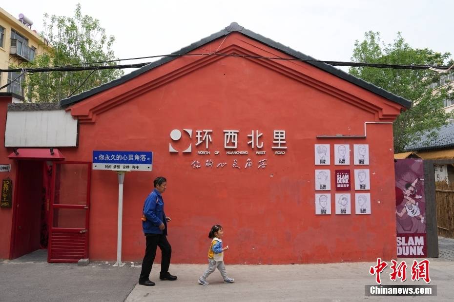 5月10日,居住在附近的市民带着孩子从环西北里文创街区前经过。崔楠 摄