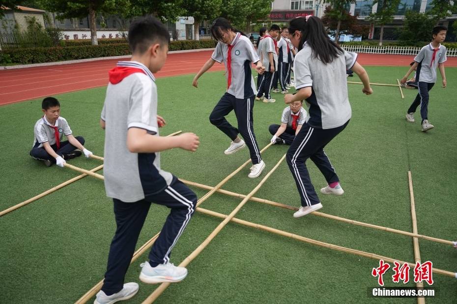 5月10日,济宁七中的学生们练习体育游戏竹竿舞。崔楠 摄