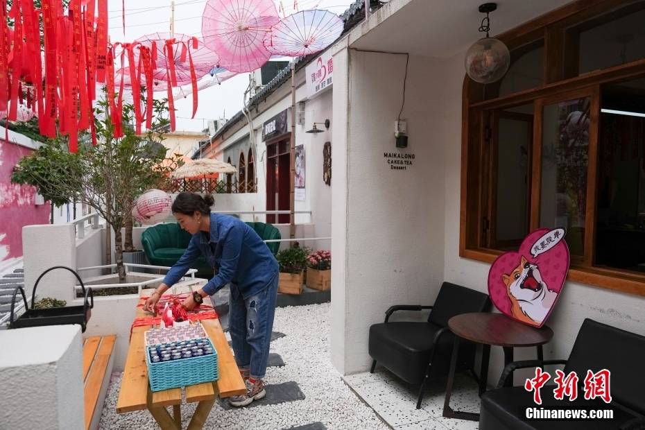 5月10日,郭蕊正在位于环西北里文创街区的月老阁整理许愿丝带。相较于传统楼宇,作为月老阁负责人的她更看中环西北里的独特庭院环境。她相信街区的活力与朝气,也会助益她的婚恋主题事业。崔楠 摄