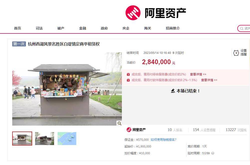 当天同时结束拍卖的还有杭州市西湖风景名胜区白堤(锦带桥西侧)商亭租赁权,该商亭面积也只有4.5平方米,成交价格为160万元/年。