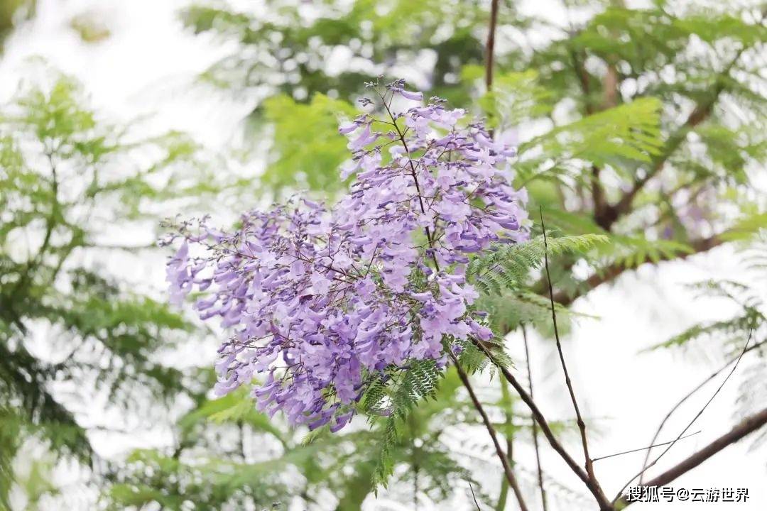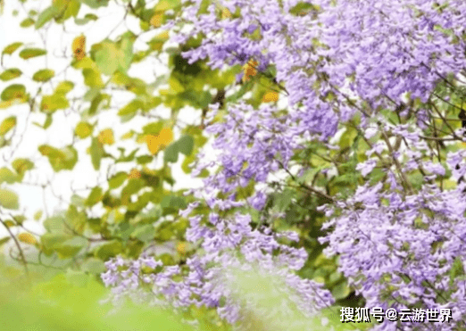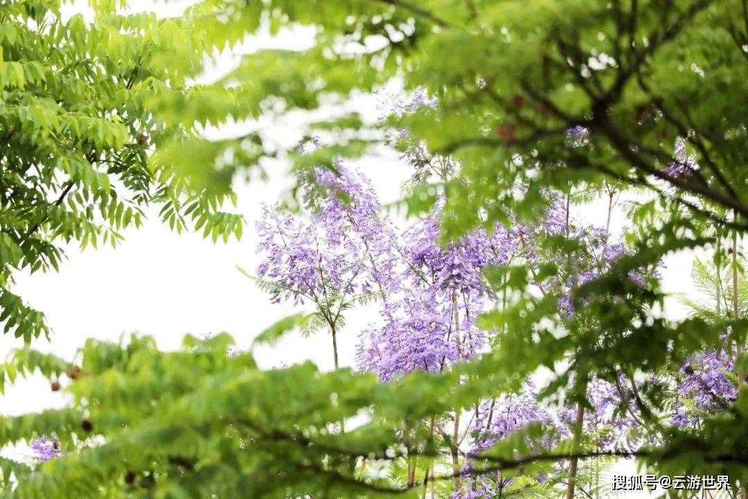 抬头看去,一簇簇蓝紫色的花朵盛放在嫩绿的树叶间令人陶醉。